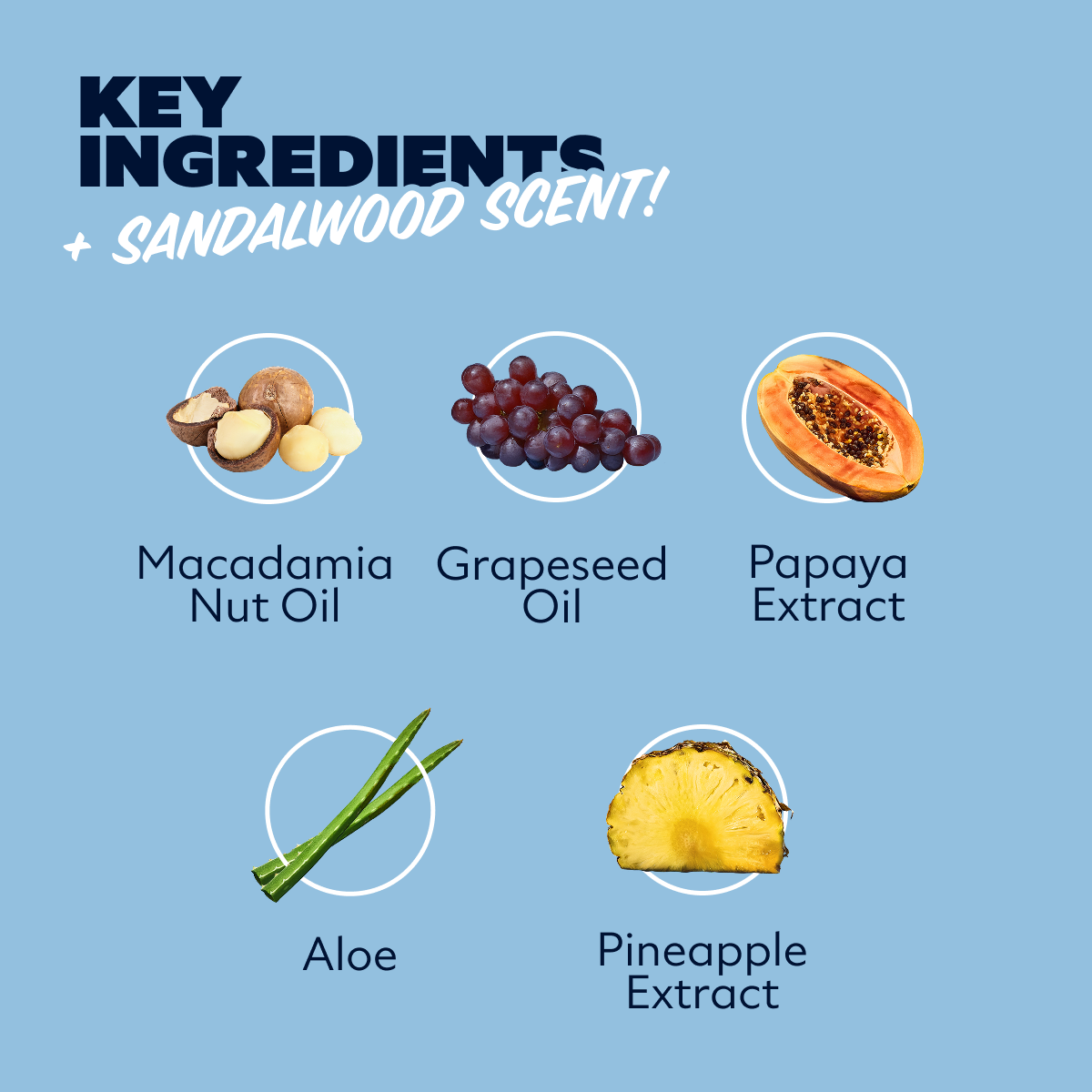 Water/Aqua/Eau, Cetearyl Alcohol, Glycerin, Cyclopentasiloxane, Behentrimonium Methosulfate, Macadamia Ternifolia (Macadamia) Seed Oil, Vitis Vinifera (Grape) Seed Oil, Propanediol, Avena Sativa (Oat) Kernel Extract, Salix Alba (Willow) Bark Extract, Aloe Barbadensis Leaf Extract, Laminaria Digitata Extract, Carica Papaya (Papaya) Fruit Extract, Ananas Sativus (Pineapple) Fruit Extract, Camellia Sinensis (Green Tea) Leaf Extract, Panax Ginseng Root Extract, Dimethicone, Phospholipids, Retinyl Palmitate, Ascorbyl Palmitate, Tocopheryl Acetate, Leuconostoc/Radish Root Ferment Filtrate, Hydrolyzed Barley Protein, Opuntia Ficus-Indica (Prickly Pear) Extract, Dimethiconol, Hydroxypropyl Guar Hydroxypropyltrimonium Chloride, Propylene Glycol, Citric Acid, Disodium Edta, Ethylhexylglycerin, Potassium Sorbate, Sodium Benzoate, Benzyl Alcohol, Phenoxyethanol, Acetyl Cedrene, Citrus Aurantium Peel Oil, Citrus Limon Peel Oil, Limonene, Linalool, Linalyl Acetate, Tetramethyl Acetyloctahydronaphthalenes, Vanillin, Fragrance (Parfum).